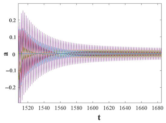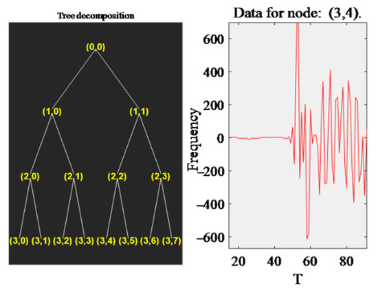 The acceleration data of each node was extracted by the Newmark method and imported into MATLAB for analysis. The optimal wavelet packet decomposition layers adopt the data of node 2 under Case 1 as an example, as indicated in Figure 5. Figure 6 is the excerpted signal of the wavelet packet tree at the node and the corresponding (3, 4) node obtained after decomposing the wavelet packet.