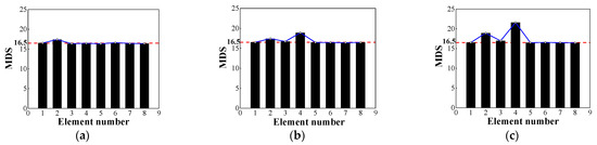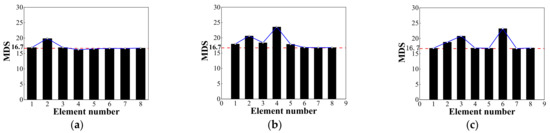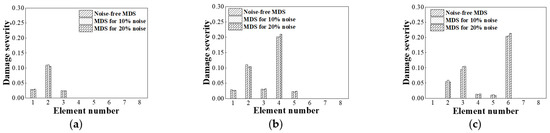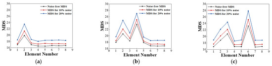 Figure 12a–c above indicate the changes in MDS values after adding different levels of noise in Cases 1, 2, and 3. In the noise-added environment, the MDS value of the element in the healthy state and the MDS value of the damaged element are both increased. With the increase of the noise-added level, the increase of the MDS value also accelerated. For example, in the process from no noise to 10% noise, the MDS value of element 7 increases by 4% in Case 3, while in the process from adding 10% noise to 20% noise, the MDS value increases by 6%. At the primary damaged element location, the rate of increase is greater than that at the healthy state node. For example, the MDS value of element #2 changes from 20.6 to 22.5 and then to 24.8 in Case 2, while the MDS value of element #3 in the healthy state changes from 18.4 to 19.6 at 10% noise and then to 20.9 at 20% noise.