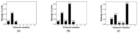 It can be observed from Figure 11 that the damage severity calculated under the three cases is mostly consistent with the preset damage severity of each element. There are some elements identified as damaged around the main damaged element, which may be due to the short distance from them to the primary damaged element [11,15], but the damage severity of the adjacent damaged elements is within the allowable error range. Therefore, the change rate between the MDS value of the element that exceeds the MDS value in the healthy state and the MDS mean value in the healthy state is defined as the objective function, and the improved HTF-SAPSO algorithm is used for iterative operation to quantify the damage severity, where the research method has a good identification effect. In summary, it can be preliminarily verified that the research method for structural damage identification based on WPE-MDS and HTF-SAPSO is feasible.