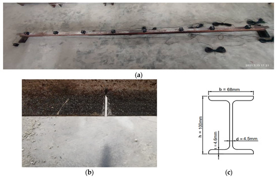 The I-shaped steel beam. (a) sensor layout. (b) View of introduced damage. (c) Cross section.