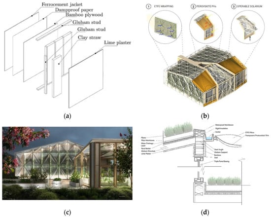 The first project, namely, the Y-Project, used a Y-shaped roof, hence the name “Y”. The “Y” also references the Chinese character for “people (人)”. The design concept was based on the human living environment and incorporated solar heating, daylight, and agricultural production to achieve carbon neutrality []. The structural system used bio-based materials to provide long-term carbon storage, wherein bamboo and straw were joined together to develop a new structural system (Figure 3a). The building envelope used adaptive outer films of ETFE and perovskite photovoltaic (PV) cells, which supplied almost 100% of the building energy. The ETFE membrane mixed the thermal response, natural ventilation, and daylight functions. It could also protect the plant walls during the cold period for carbon neutrality (Figure 3b). The plant walls and natural materials guaranteed better air quality (CO2 absorption, oxygen release, no VOC emission) (Figure 3c). A greywater reclamation system was selected to recycle and reuse greywater in the household for non-potable purposes. Water from bathtubs, showers, kitchens, and washing machines were treated and reused for toilet-flushing purposes (dual supply) and landscape irrigation, significantly reducing the reliance on water (Figure 3d) [,].