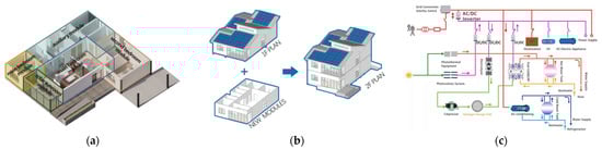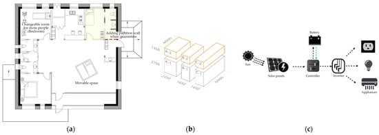 The 24 × 35 Housing Home refers to 24 h-a-day living and 35-year residential life through the changeable design of the space to meet the users’ varying functional needs in the full life span of the house to achieve sustainable development, especially carbon neutrality []. The architectural design concept combined changeable space for different needs, especially for epidemic patients who do not need to quarantine in a hospital, making the design suitable for low-carbon living to some extent (Figure 4a). The structure adopted a three-stage component assembly strategy, which included the framework, structural insulated panel systems (SIPS), and related decoration. The module size was designed to meet the capacity of a 1AAA 40-foot-high container to facilitate transportation for low-carbon development (Figure 4b). The renewable energy system used the PV effect of solar cell semiconductor material to convert solar radiation into electric energy. Then, the electric energy through the controller charged the battery or supplied the load using the accumulator when the sunlight was insufficient (Figure 4c) [].