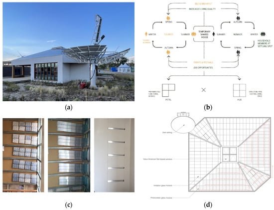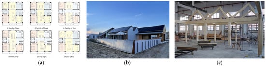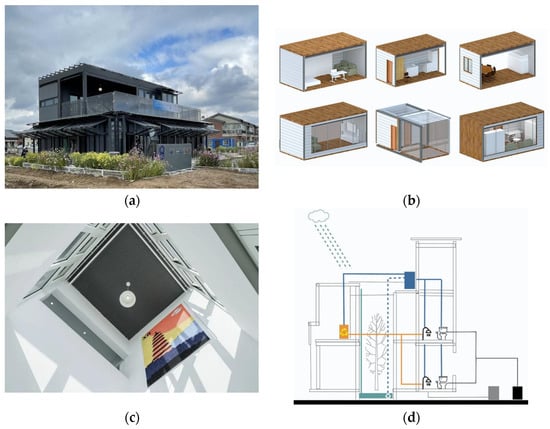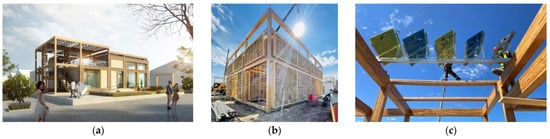 The Modular Sustainable Cube used straw bale modules to build a house to achieve carbon neutrality (Figure 5a). The modular straw bale wall enclosure structure was simplified into five modules and was prefabricated in the factory to avoid unnecessary carbon emissions at the construction site using the Engineering Procurement Construction (EPC) model [] (Figure 5b). The combination of each module ensured the diversity of architectural space and architectural form. It also focused on energy production through the roof’s colorful light-transmitting PV panels to maximize the utilization of natural resources [] (Figure 5c).