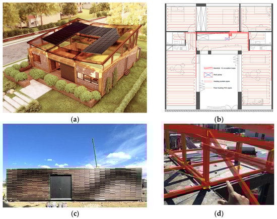 Main results of the T&A House. (a) Assembled T&A House. (b) SST wall. (c) PV used. (d) Ground source heat pump system.