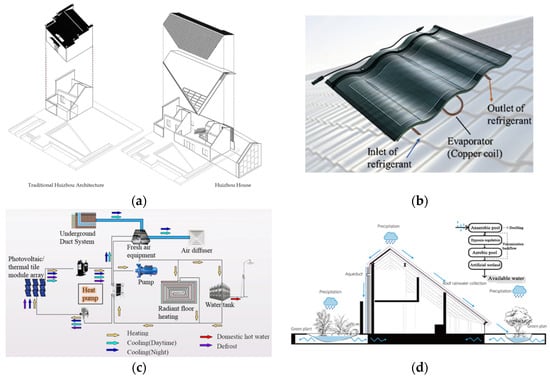 The HUI House was based on Huizhou-style architecture, which is the famous architectural style in China. The building aimed to adopt traditional Huizhou architecture and transform and utilize it in the new era, especially for rural revitalization. The HUI House focused on carbon neutrality by using green building technologies to try to solve the common problems of low quality in traditional Huizhou architecture (Figure 8a). A flexible thin-film solar chip was precisely encapsulated in the glass with highlight transmittance through the laminated packaging process of inner and outer layers. It converted solar energy into electric energy and renewed the traditional tiles with a new aesthetic. With the evaporator installation, the working temperature of the PV cell decreased, which could maintain the photoelectric conversion efficiency (Figure 8b) []. A multifunctional supplying system combined the solar-assisted heat pump with power heating and cooling. The heating was not only used for hot water but also for radiant floor heating. The generated electricity also drove the operation of the fresh air equipment to realize fresh air effectively. Moreover, an underground duct system was used to adjust the supply air temperature to form a passive and active carbon neutrality system (Figure 8c) []. As for rainwater use, an artificial wetland was planned to be built for rainwater purification using the anaerobic pool, hypoxia regulation, and aerobic pool (Figure 8d) [].
