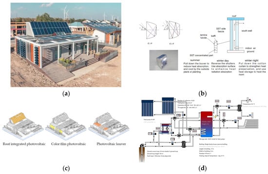 The T&A House was named for the participating universities of CUMT and AGH. The building concept, which was based on traditional Chinese quadrangle dwellings, was used with the aim to construct a carbon-neutral, zero-energy house. Considering the prefabricated construction, the building was divided into four kinds of modules and then assembled on site (Figure 10a) [,]. Passive technologies were used, including a selective sunlight tunnel (SST) wall, a skylight over the courtyard, a sunroom, and a self-shading corridor. The SST wall used compound parabolic concentrators in the wall to optimize the spotlight effect to adjust the indoor thermal environment, whether in summer or winter (Figure 10b) [,]. Active technologies were also considered. The PV components were not only used on the roof but also installed on the western wall to maximize solar energy (Figure 10c). Among all the participants, the ground source heat pump system was used by only this team. This solar system had the role of cooling the roof in the summer and heating the floor in the winter (Figure 10d) [].