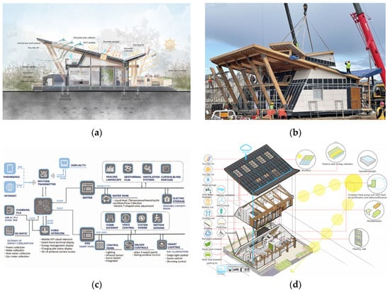 R-CELLS stands for renewable, recyclable, reconfigurable, resilient with customization, energy surplus, life cycle, livability, and smart. The designers intended to produce low-carbon and self-organizing cells. This building aimed to achieve a solar house prototype with positive energy, full recycling, smart use, and zero emissions by adopting a close-to-nature design, prefabricated modules, intelligent systems, and energy integration technologies. For a close-to-nature design, positive architectural design methods were considered. The building drew on traditional Chinese architecture, namely, “anti-universal to the sun”, to form an asymmetric V-shaped roof for the maximum use of the south-facing natural lighting and to increase the solar gain on the north-sloping roof at the site in northern China. The main building material used was wood, which is recyclable, reconfigurable, and resilient (Figure 11a). For prefabricated modules, five customized modules divided into 15 parts for this building were used to decrease the transportation emissions and the life-cycle emissions based on the users’ needs (Figure 11b). For intelligent systems, based on the building information model, the integrated and efficient design model was created in the design phase. The energy management, environmental regulation, smart home scenarios, and voice interactive and smart housekeeper systems were used in the physical building, giving users a comfortable, low-carbon life (Figure 11c). For building energy integration technologies, thin-film PV and solar photovoltaic/thermal (PV/T) modules were installed on the roof. Five vertical axis wind turbines were also used at this windy competition site. The battery stored and supplied power. Photovoltaic, energy storage, direct current, and flexibility load (PEDF) technologies were used in this building. Moreover, the rainwater collection from the roof through grey water treatment formed complementary utilization of multiple energy sources (Figure 11d) [].