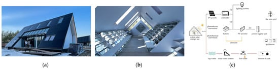 The Pitched House was named for the architectural model, where the roof was inclined at 45 degrees. It aimed to be a multi-function house for living, entertainment, and work to achieve carbon neutrality. The building has two floors to use PV panels on the roof as much as possible. The panels installed on the 45-degree south-sloping roof not only maximized the use of sunlight to achieve carbon neutrality as soon as possible but also formed attractive architectural shapes (Figure 13a). The whole building incorporated a smart energy management system that used the automatic windows on the second floor to regulate indoor temperatures throughout the year (Figure 13b) []. Along with photoelectric conversion, photothermal conversion was also used for hot water (Figure 13c) [].