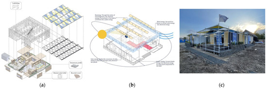 BBBC is an acronym for bag, box, building, and cloud. The architecture concept was aimed toward post-disaster reconstruction; therefore, prefabrication and energy self-sufficiency were the most important aspects. Regarding prefabrication, more than 80% of the building design utilized recyclable material, such as aluminum profiles, mineral water bottles, recycled wood, and scaffolding (Figure 14a). The materials can be reused in the future, which is good for decreasing the carbon emissions at the building material level. Concerning energy self-sufficiency, the whole building combined bioenergy, wind energy, solar energy, and kinetic energy to supply electricity for the building (Figure 14b). The building can achieve carbon neutrality and even be carbon negative with time. Overall, this building contributed to carbon neutrality by using prefabricated construction and being lightweight, recyclable, energy-efficient, and so on [] (Figure 14c).