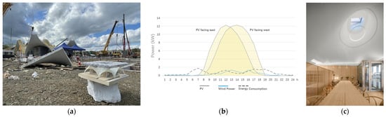 The Solar Ark 3.0 is the third generation to participate in SDC’s architectural works, where it pursued the application of new technology and new energy []. The Solar Ark represents the continuous exploration of a better future for human life and environmental sustainability. Ultra-high performance concrete (UHPC) was used by parametric design according to graphic statics to achieve UHPC hyperboloid shells, which were prefabricated in the factory in advance. The whole building consisted of 20 shells, but all the shells were generated using only one mold. This was very helpful for carbon reduction. In addition to applying this high-strength UHPC, it saved nearly two-thirds of the concrete consumption compared with the traditional frame structure under the same building scale (Figure 15a). As for the building energy, 68 solar panels were installed on the building to maximize the use of solar energy. The special feature was that the solar panels were installed in the east–west direction, which could increase the production capacity by 10% compared with the north–south direction when using the same area, and at the same time, adapt to the law of indoor electricity consumption. In addition to solar energy utilization, wind energy was also used in the building to achieve multi-energy complementarity. A vertical wind turbine was installed in the site’s northeast corner to generate electricity 24 h a day. An air source heat pump was also used in the building. The total calculated annual electricity generation was 5.2 times the electricity consumption (Figure 15b) []. This building could achieve carbon neutrality after 9 years of operation []. Passive technologies were also used for carbon reduction. Two skylights on the roof greatly improved the indoor natural lighting and ventilation situation (Figure 15c) []. The doors and windows had a thermal conductivity of 1.1 W/m2·K and a solar heat gain coefficient of 0.7 to achieve high efficiency and energy savings []. Along with the prefabrication, energy complementation, and passive technologies, a variable layout according to the user’s needs, rainwater recycling, bamboo furniture, and other aspects were achieved in the building for carbon neutrality.