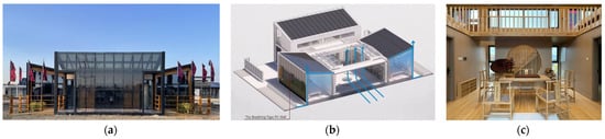 The Pixel House, which was named based on its changeable and flexible spaces, met multiple needs and achieved energy saving and carbon neutrality goals. The indoor movable modules could create multiple spaces for different uses. The functions of this building not only formed various living spaces for various family members with the changeable modules but could also change according to the needs of certain activities. This was beneficial for meeting the changing needs of occupants and reducing carbon emissions to a certain extent (Figure 9a). This building used passive priority and active combination technologies to achieve carbon neutrality. For passive technology, the Trombe wall system was used to save the energy of the thermal environment. The active technology mainly used the BIPV technology on the roof to generate electric energy. Solar bricks and lamps were used in the courtyard. The fence also used PV panels to increase the energy production area (Figure 9b) []. The structure of the building was based on prefabricated wooden beams and columns to facilitate quick installation, which decreased the construction carbon emissions, and the wooden material was recyclable and acted as a carbon sink (Figure 9c) [].