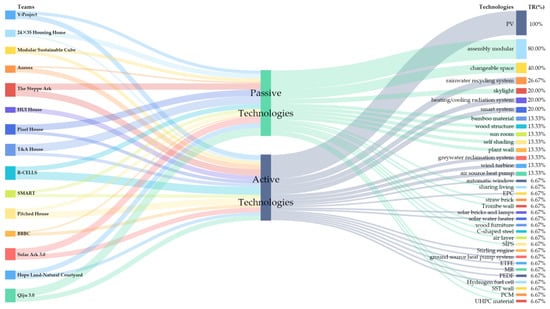 For further discussion, these technologies could be divided into active technology and passive technology. There were at least 35 kinds of technologies used in this competition. Based on statistical frequency analysis, a Sankey diagram was generated for the technology ratios (TRs) in Figure 18. This showed the frequency of use of the technologies in these 15 buildings. PV (100%) and modular assembly (80%) were the most used technologies for pursuing carbon neutrality. Almost every building examined here actively used solar energy to achieve carbon neutrality and combined prefabrication in a passive way to reduce carbon. Thus, to achieve carbon neutrality to solve global warming, using PV panels to generate electricity and fabricating the building modules in a factory in advance represented a consensus in this advanced competition [].