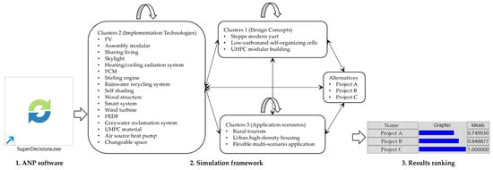 Moreover, due to COVID-19, the final review of SDC cannot start yet; thus, objective data are lacking. However, analytic network process (ANP) analysis could be used to simulate the ranking to compare with the present methods []. Here, only three projects were chosen for ranking due to the enormous calculation load. The names of these three projects have been hidden to avoid any conflicts. Based on these buildings’ technology applications, 17 different technologies were counted. From the design concepts, implementation technologies, and application scenarios, three clusters were established to determine the priorities of these projects. The Super Decisions software showed that the ideals of Project C scored 1, which was better than Project B (0.85) and Project A (0.75), which meant that Project C was the best one of these three (Figure 19). This part of the research was just for showing the method of ANP that may be applied for SDC ranking based on the present ranking rules of 1000 points in total without violating the 10 contests of the SDC. In fact, different contests or sub-contests should be affected by each other with multiple weights. More scientific results lead to better carbon neutrality demonstrations.