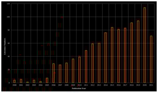 Figure 1 shows that the literature in the LEED research field shows an increasing trend year by year from 2000 to 2021. Specifically, before 2006, the number of related papers increased slowly because LEED was in the early stages of development. The number of papers started to show a significant increase in 2006 and has maintained stable growth every year. (The literature retrieval time of this study was November 24, 2021; thus, literature appearing in WOS thereafter was not included in the statistics.) This finding indicates that research on LEED has entered a stage of steady growth, and researchers’ attention to the field of LEED has also shown a sustained and stable state.