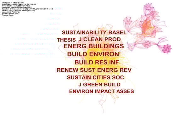 In CiteSpace, we selected 2000 to 2021 as the time span, 1 year as the time slice, and “Reference” as the label type for visual analysis. Finally, Figure 6 was obtained. The reference co-citation network of the LEED literature contained 800 nodes and 2876 links. Nodes represent cited papers. The larger the node is, the more frequently the paper is cited and the more important it is within the LEED research field. The connecting lines between nodes indicate the co-citation relationship between different nodes.