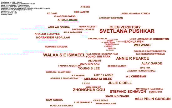 In CiteSpace, we selected 2000 to 2021 as the time span, 1 year as the time slice, and “Author” as the label type for visual analysis. Finally, Figure 3 was obtained.