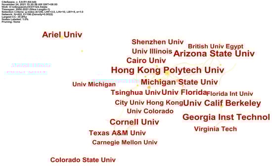 In CiteSpace, we selected 2000 to 2021 as the time span, 1 year as the time slice, and “Institution” as the label type for visual analysis. Finally, Figure 4 was obtained.