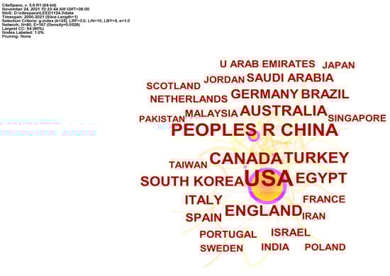 In CiteSpace, we selected 2000 to 2021 as the time span, 1 year as the time slice, and “Country” as the label type for visual analysis. Finally, Figure 5 was obtained.