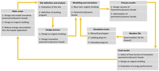 A six-phase methodology has been developed, in which each phase follows the previous one and is connected linearly to each other. The research took place in Al Ain City. The selection of the site is based on the fast growth of the city and the importance it has played in the country’s development. The UAE a has hot arid climate. Al Ain is a city located near the Jebel Hafeet Mountain on the border with Oman. The geographical position of the city impacts the climate; therefore, Al Ain has a lower humidity level than the coastal cities such as Abu Dhabi, Dubai, Ras al Khaimah, or Fujairah. The data used for this research is based on information taken from the UAEU University and from site observation. The modeling evolves into two main lines; the base model, and the upgraded model, by applying the parametric/dynamic façade. The obtained results are analyzed, and the application of the advanced façade is evaluated (Figure 1).