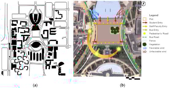 (a) Surrounding building footprint analysis, (b) site analysis map.