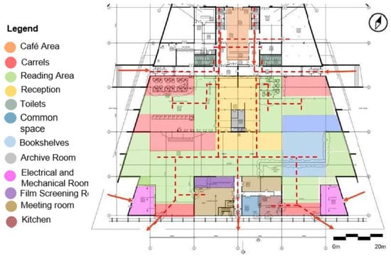 The existing UAEU Library has been analyzed for its structure, spaces, and areas in order to help the library extension area program and to analyze necessary or unnecessary spaces in the extension. The UAEU existing library has spaces such as a café area and carrels at the beginning of the left entrance arrow in the red color (Figure 6). The reading area is the most used space in the building. At the second main entrance into the library, the reception will be at the entrance to address any questions or offer help. In the southeast, the library will have common spaces, meeting rooms, and kitchens. Finally, the doors placed in the southeast take us to the site we are analyzing. The library is considered a long-span structure, with a structural system of steel posts and beams. Steel columns are 0.15 m per 0.15 m, and their spacing is 16.8 m. The structure shows the horizontal and vertical grids shown in the columns. The library structure is a very symmetrical structure that makes it easier for the load to be handled.