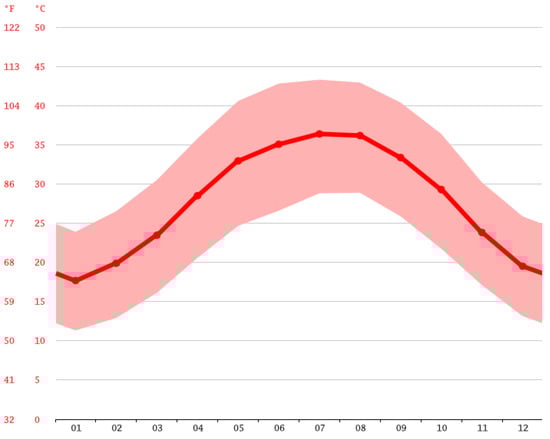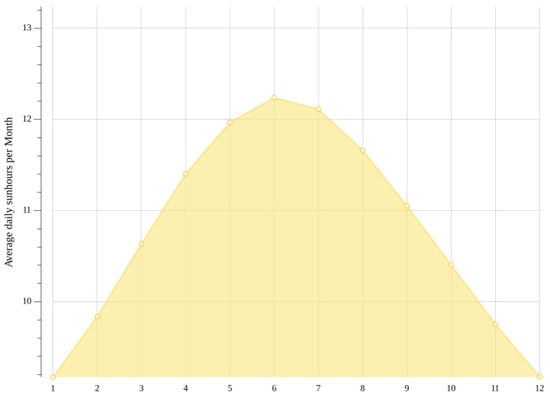 The UAE has a hot arid climate. Al Ain City has an average yearly temperature of 28 °C. The warmest month is July, with an average of 36.4 °C. In January, there is an average of 17.7 °C (Figure 7). Al Ain has an average of 129.41 h of sunshine per month. June is the month with the highest average number of sunshine hours, with an average of 12.11 h. January has the lowest values, with 9.18 h of sunshine (Figure 8). Due to its location towards the inner part of the country (border with Oman), the city has lower levels of humidity. The month with the highest relative humidity is January (51.08%), and the month with the lowest relative humidity is May (20.93%) (Table 1) [].