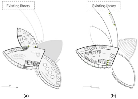 (a) Model of the library extension in REVIT, (b) simulation in RHINO.