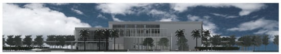 The design of the library extension with organic architecture was done with the aim of integrating the building with the landscape that is currently on site (Figure 9). This building design is considered the base case as it refers to the building prior to the parametric/dynamic façade. However, the elevation also shows the integrated façade. The design process of the main building is described as follows. The landscape development has the actual number of trees already found, which is equal to the ones shown according to the type as illustrated. The program and function plan have all the areas organized, and it will be 1034 sqm. However, there are some strengths and weaknesses in this design. The studies show that the strengths of this building are its ability to reflect art and creativity, its flexibility, its integration with the landscape, and the integration of space that gives a comfortable feeling. There are also some weaknesses in the development of this project. For example, the largest weakness found is the load of the dynamic façade. The figures below illustrate schematic drawings of the chosen development. The plans and the 3d are shown in Figure 10 and Figure 11. Meanwhile, Figure 12, Figure 13, Figure 14 and Figure 15 show the building elevations from different directions [].