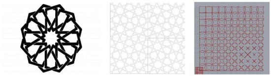 The design of the elements of the façade is inspired by IGP (Figure 16). There is a great history of use of IGS patterns in the Middle East. The use varies from decorative (in entrances of buildings, façade walls) to functional (mashrabiya application). The mashrabiya as an architectural element allowed houses to have privacy, shading, and natural ventilation. This element of passive sustainable strategies combined with advanced tools such as Rhino Grasshopper are the basis of this research on the parametric/dynamic façade. Based on the ISG, the design of the main unit of this façade evolves by adding other parameters such as size of unit (linked to the technology of application), material, opening distance, and connection to the library extension building [,].