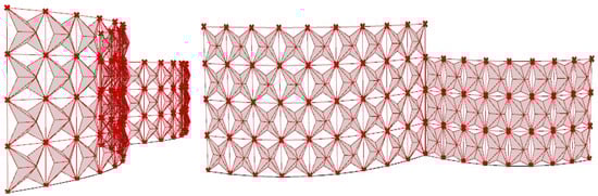 The modeling process of the selected pattern starts with the main points of the geometry. Next is to draw the pattern, with each point defined. To create the mechanism of folding inwards and outwards, a point is defined at the center away from the plane to allow for folding distance (Figure 18). The mechanism of the pattern is to fold inwards and outwards based on the sunlight [,]. First, before drawing the pattern, the surface needs to be defined and divided up according to its dimensions. The script used in the rhino software is shown in Figure 19. This script has been modified and adapted continuously based on the optimization process based on the daylight analysis, solar radiation, and impact on indoor–outdoor visibility. Figure 20 shows the geometry of the structure after the connection of all points defined earlier in the process [].