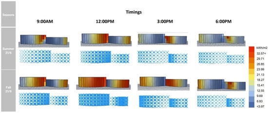 Most of this energy is spent on cooling and heating, in accordance with the climatic regions and seasons of those areas. Due to the factors listed above, building envelopes play a significant role in the building’s energy efficiency. The building envelope, such as the building façade, is responsible for connecting the indoor and outdoor environments, and plays an active role in creating an interior environment that has positive effects on the environment, as well as people’s health and productivity. Building façades account for more than 40% of heat loss in the winter and for overheating in the summer, which are factors that have a significant impact on energy usage. Façade orientation and the building glazing ratio, for example, the use of large glass panes and windows, which are frequently used in office buildings, can be greatly impacted by direct solar radiation. Overexposure to the sun’s rays damages semi-transparent façade materials visually and increases cooling energy demand [,].