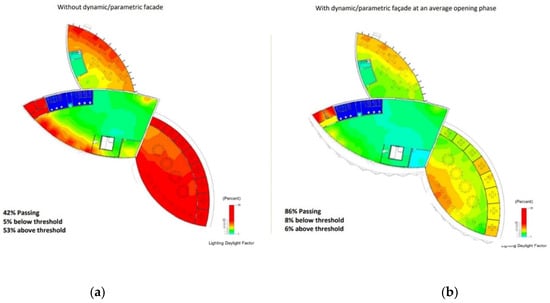 Based on the process of design, modelling, and simulation, the organic building design with an integrated parametric dynamic façade was achieved. The visual connection between indoor and outdoor is achieved with the adjustment of the façade unit size and opening. As a result of the application of the innovative façade, the indoor lighting has been improved by 44% (Figure 29).