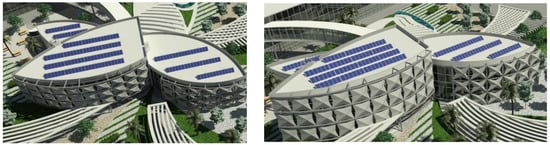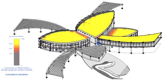 Based on the energy simulation results, there is a reduction of 25% in energy consumption in the building. If the PV panels are added to the energy reduction, then the electricity savings will reach 70% (Table 3 and Table 4). This due to the large areas in the roof where the panels can be added (Figure 30). Additionally, there is a benefit impact on the environment by using the dynamic façade and the glazing systems in the building that can be enhancing the sun light entrance without the usual heat found in the UAE climate. This will help in reducing the energy used by reducing artificial lighting [].