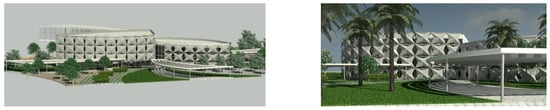 The site location and surroundings are shown in Figure 2. Site analysis was done (Figure 3) and decisions were made based on the study. The soil type here is Tropopsamments, which has low dunes and a range of suitability. The soil is not very strong, but there is no special treatment needed for the soil. The decision is to use a type of specific foundation, a shallow foundation, and this will achieve the requirement. In the topography part we will have flat land and no hills. This area is totally straight and has no bumps or hills. According to the existing landscape elements, construction may cut existing trees and remove water bodies. Taking advantage of greenery (Figure 4), we integrated design with some of the exiting greenery. There is no pedestrian access to the site for students, as student access is only through the library. However, there is bus access, and some staff entries could be used for students as well. The space is enclosed by a fence which must be removed and a new entrance must be provided for students. Since the site is surrounded by a building, the only source of noise is the bus sound. Therefore, sound insulation is needed in the building, and some fountains can be added to reduce the amount of noise surrounding the space. Figure 5 shows images of the façades of the buildings surrounding the selected site. This analysis was done in order to create an architectural connection with the new building [].