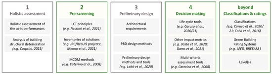 Figure 2). In the first section, tools for a preliminary qualitative evaluation of eligible retrofitting interventions are presented. In the second section, decision-making tools for the selection of the most sustainable solutions among the pre-designed ones are collected based on quantitative indicators. In the third section, classification and rating systems to be applied at the end of the design process to have access to incentives, premiums or certificates are discussed. The Level(s) framework [