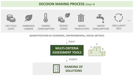 Once candidate solutions are identified and preliminarily designed, the best option should be selected for the detailed design development. Decision-making tools should thus be adopted to define the optimal retrofitting strategy based on quantitative economic, environmental and social metrics. The procedure for the identification of the best strategy can be articulated in two main phases: