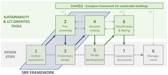 Figure 6) into the steps of the design, which are revised to foster holistic renovation and include new LCT-based design objectives and targets (green and grey boxes in