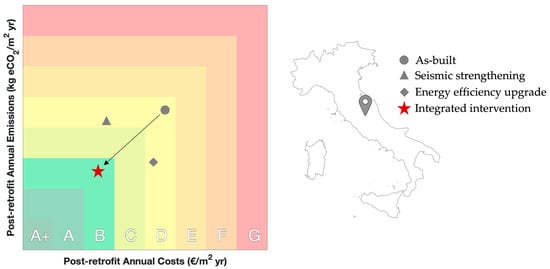 Figure 8 shows an illustrative example for the same hypothetical building above, assuming it to be located in central Italy, i.e., a region that is characterised by high seismic and energy demands. It is noted that seismic strengthening and energy efficiency refurbishment techniques alone produce a significant reduction of either running costs or emissions, whilst only the integrated option aimed at improving both seismic and energy performance ensures their concomitant reduction.