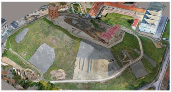 The investigated surface of the Gediminas Hill area was scanned and a 3D surface model was created from simple photographs using the Acute3D Viewer [] software. To ensure the high resolution of the 3D surface model, photogrammetry, computer vision, and computational geometry algorithms were used, fulfilling industrial quality requirements in terms of precision, scalability, efficiency, usage, robustness, and interoperability. A general view of the Gediminas Hill 3D surface is presented in Figure 1.