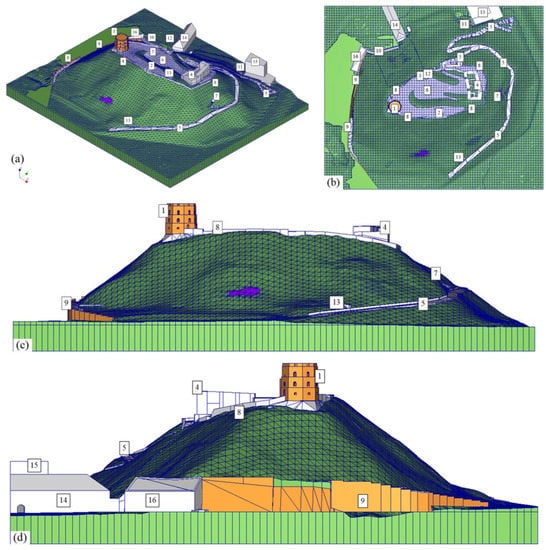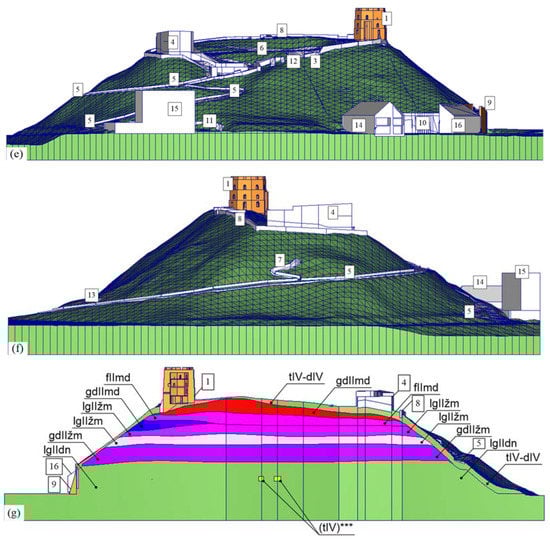 Gediminas Hill FEA model isometric view (a), top view (b), south view (c), west view (d), north view (e), east view (f), and geological cross-section (g). 1:remains of upper castle western tower; 2: remains of upper castle south tower; 3: remains of Upper castle north tower; 4: remains of Upper castle; 5: pedestrian path; 6: remains of Upper castle pitch; 7: eastern slope spring; 8: remains of Upper castle defensive wall; 9: remains of Lower castle western retaining wall; 10: remains of Lower castle northern retaining wall (I part); 11: remains of Lower castle northern retaining wall (II part); 12: funicular; 13: remains of Lower castle southern tower; 14: remains of Old arsenal western corpus; 15: remains of Old arsenal; 16: remains of Lower castle house of castle-keeper.
