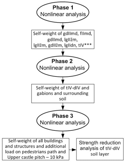 The behavior of the numerical model and slope stability were determined through a four-stage calculation analysis. All four stages were assigned to three phases. In the first stage, the self-weight of the natural soil layers and tunnel backfill were evaluated (Figure 4, Phase 1). In the second stage (Figure 4, Phase 2), the self-weight of the technogenic soil layer (tIV-dIV) and gabions in the northern slope part (Table 3) were evaluated. The gabions were installed on natural soil layers to replace technogenic soil due to the occurrence of a shallow landslide in 2016 []. The third stage (Figure 4, Phase 3) involved evaluating the construction and self-weight of buildings, as well as additional loads on the pedestrian pathway (Figure 3) and the remains of the Upper castle pitch (Figure 3). In the fourth stage (Figure 4, Phase 3), slope stability calculations assessing the reduction in the strength of the technogenic soil layer saturation were initiated [].