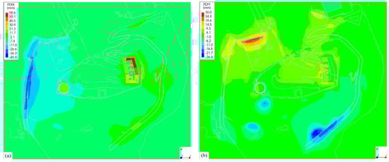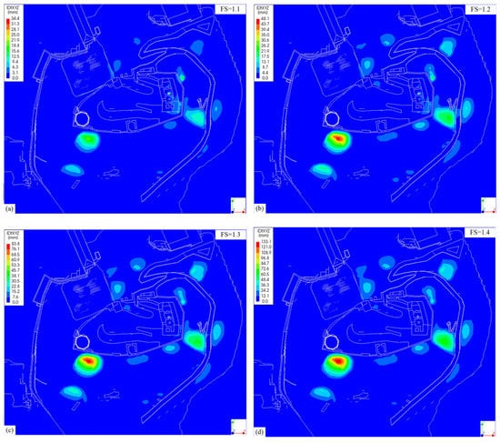 Strength reduction analysis of the technogenic soil (tIV-dIV) layer (Figure 7) allowed for us to determine areas with the highest concentrations of displacements. Strength reduction analysis indicated not only displacements of the technogenic soil layer (tIV-dIV), but also displacements of constructions and buildings (in some places, the technogenic soil layer is under the foundations). In each SRF calculation, the depth of the technogenic soil (tIV-dIV) layer is different due to the soil displacements, where the newly formed soil mass is evaluated. When shallow landslides form, they include only technogenic soil (tIV-dIV). The increasing mass and volume of the moving soil causes stability failure, and a local shallow landslide occurs.