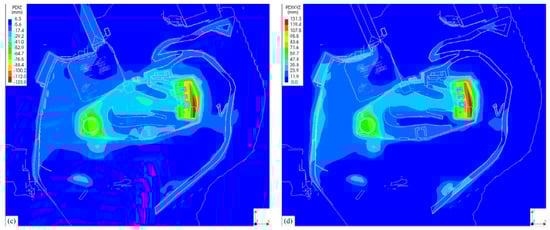 Displacements of third simulation phase (factor of safety 1.0): (a) x–axis; (b) y–axis; (c) z–axis; and (d) displacement vector.
