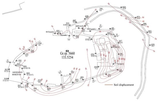 The displacements presented in Figure 5 showed the same tendency as the monitoring data (presented in Figure 6). Thus, the compiled 3D numerical model can present the same slope movement tendencies. It is very problematic to obtain authentic results when historic object behavior is simulated, as the buildings in the model were built of bricks and stones in 1419, partially demolished in 1655–1661, restored and conserved in 1816–1817, 1930–1939, and 1956–1963, and conserved and partially restored in 1990–1993 []. Thus, the biggest concentration of soil displacements was close to the remains of the Upper castle western tower and the Upper castle remains (Figure 5). Seeking to develop a prognosis for the possible formation of landslide areas, strength reduction calculations were carried out in the third simulation phase (Figure 4). The strength reduction analysis was applied only to the tIV-dIV soil layer (Table 2), as existing knowledge and monitoring data [] have shown that landslides only form in the tIV-dIV layer. These landslides are shallow.