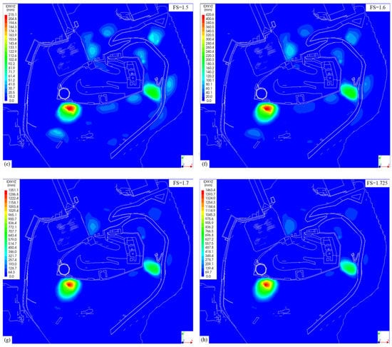Incremental displacement vector at different factor of safety (FS) values: (a)—FS = 1.1; (b)—FS = 1.2; (c)—FS = 1.3; (d)—FS = 1.4; (e)—FS = 1.5; (f)—FS = 1.6; (g)—FS = 1.7; (h)—FS = 1.725.