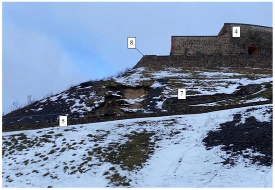 Eastern slope landslide, which occurred on 7 February 2022: 4: remains of Upper castle; 5: pedestrian path; 7: eastern slope spring; 8: remains of Upper castle defensive wall.