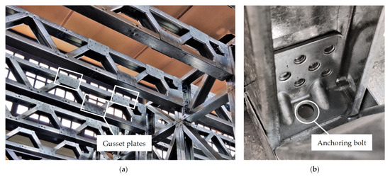 CFS truss beams are widely used in portal frames and lightweight floor joists. Single-channel or back-to-back channel sections are used as chord and web members, connected with bolts or screws, to transfer axial forces to other members through shear in the connector [8]. On the truss ends, where shear forces are greater, gusset plates are used to ensure force transfer to the ends of trusses without failure, as shown in Figure 1a.