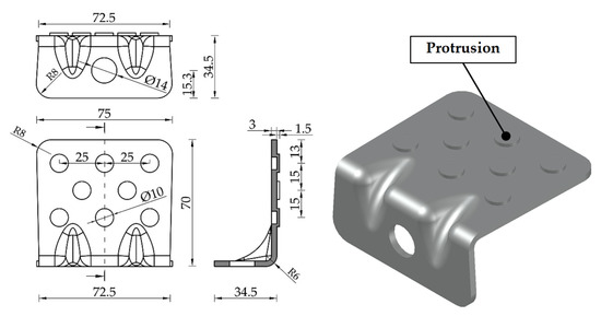 The innovative geometry (Figure 2) and connection method allowing connection to the thin-walled C-profile are essential features of the novel angle bracket. A novel angle bracket with eight protrusions is first positioned on the predrilled holes on the web of the C-profile, after which it is pressed under high pressure, forming a rigid connection. The C-profile is then, through an angle bracket, bolted to the adjacent structural element with a single M12 bolt (Figure 3).
