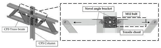 In this study, a novel angle bracket for CFS bolted connection in a thin-walled structure is proposed. A novel angle bracket can be used to connect CFS beam trusses on the ends of the chords (Figure 1a) or for anchoring the CFS column base, as shown in Figure 1b. In practice, truss floor beams or joists are generally embedded in-between the walls to reduce the height of the building, but then they behave as freely supported beams. If the truss beams are designed as continuously supported beams, they stand with a bottom chord on top of the walls. The disadvantage of this design is that it demands a greater structure height. Furthermore, extra girders that transfer the load from the upper floor must be installed at the point of support of the truss on the wall, in the direction perpendicular to the direction of the truss. Another way of achieving continuity is to extend the truss through the wall, while the top chord stands on top of it. This approach requires complex design and assembly. Additionally, the upper chord carries all of the load from the truss to the wall, necessitating additional stiffening for the load transferring area.
