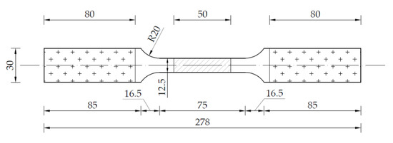 The laboratory tests were performed on the universal tension-compression test machine Zwick/Roell Z600. Test management and data registration were carried out using TestXpert II software. The specimens were tested using hydraulic jaws with a capacity of up to 500 kN. The test setup is shown in Figure 9 and Figure 10. The tension in the specimen is applied using the displacement control of the movable crosshead at a test speed of 2.5 mm/min. During the test, the axial force and displacements in the moving crosshead were recorded.